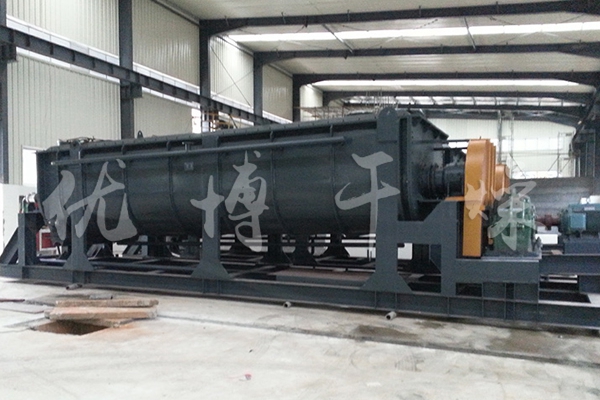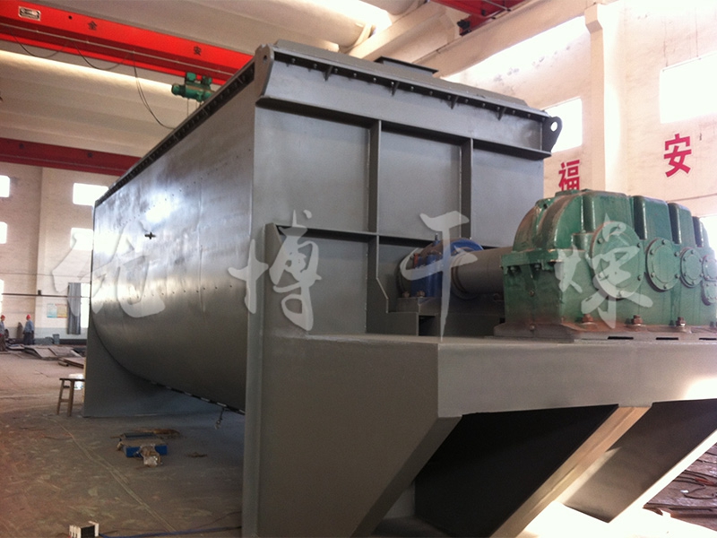 空心軸上密集排列著楔型中空漿葉,熱介質經空心軸流經漿葉。單位有效容積內傳熱面積很大,熱介質溫度從-40℃到320℃,可以是水蒸汽,也可以是液體型:如熱水、導熱油等。間接傳導加熱,沒有攜帶空氣帶走熱量,熱量均用來加熱物料。熱量損失僅為通過器體保溫層向環境的散熱。楔型漿葉傳熱面具有自清潔功能。物料顆粒與楔型面的相對運動產生洗刷作用,能夠洗刷掉楔型面上附著物料,使運轉中一直保持著清潔的傳熱面。漿葉干燥機的殼體為Ω型,殼體內一般安排二到四根空心攪拌軸。殼體有密封端蓋與上蓋,防止物料粉塵外泄而充分發揮作用。
