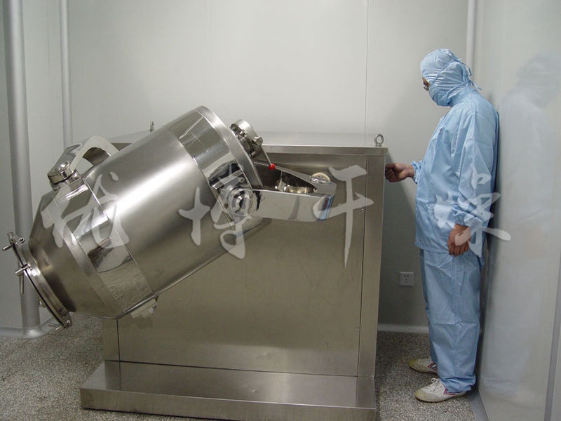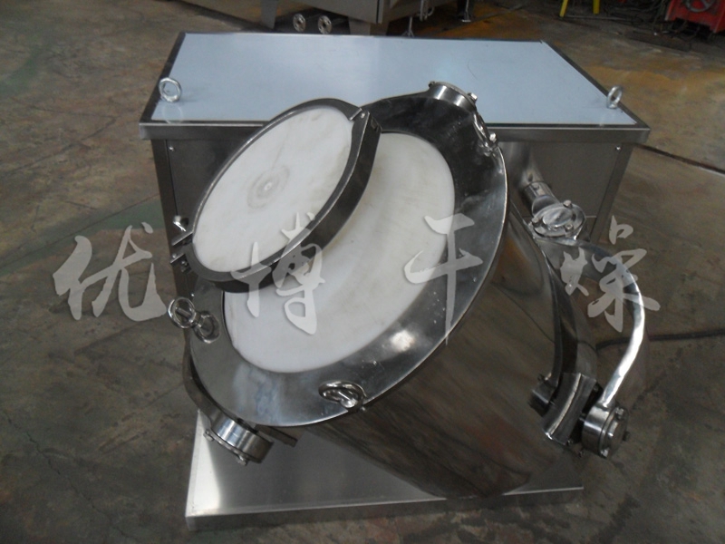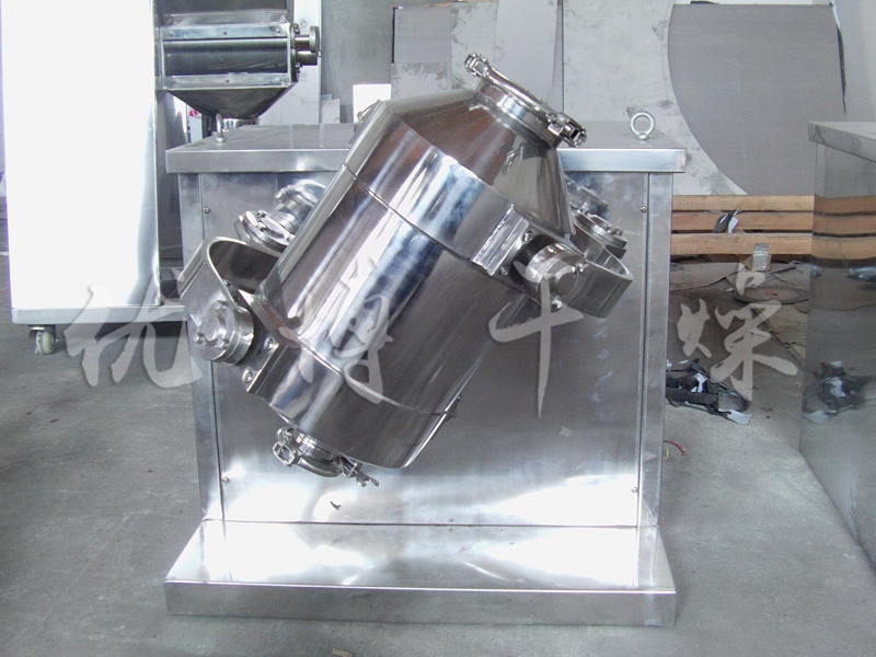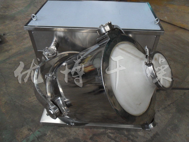 結構:該機由機座、傳動系統、電器控制系統、多向運動機構、混合筒等部件組成。與物料直接接觸的混合筒采用優質不銹鋼材料制造,桶體內外壁均經鏡面拋光。
