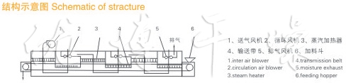 物料由加料器均勻地鋪在網帶上,網帶一般采用12-60目不銹鋼絲網,由傳動裝置拖動在干燥機內移動。干燥機由若干單元組成,每一單元熱風獨立循環,部分尾氣由專門排濕風機排出,廢氣由調節閥控制,熱氣由下往上或由上往下穿過鋪滿物料的網帶完成熱量與質量傳遞的進程,帶走物料水份。網帶緩慢移動,運行速度可根據物料溫度自由調節,干燥后的成品連續落入收料器中。上下循環單元根據用戶需要可靈活配備,單元數量亦可根據需要選取。