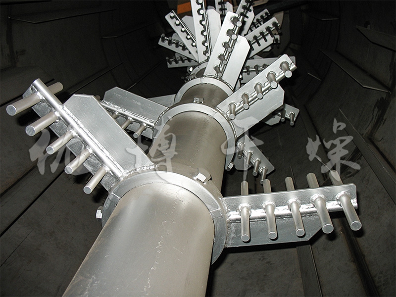 ??污泥由給料機(jī)經(jīng)溜槽進(jìn)入烘干機(jī)內(nèi)導(dǎo)料板上,隨著筒體的轉(zhuǎn)動(dòng),污泥被導(dǎo)至傾斜揚(yáng)料板上即被提升到筒體的中心位置,逐漸灑落形成料幕,高溫氣流從中穿過,使污泥預(yù)熱并蒸發(fā)部分水分。當(dāng)污泥灑落、移動(dòng)到活動(dòng)的篦條式翼板上時(shí),物料又與預(yù)熱過的篦條式翼板夾雜在一起,將熱量傳給物料,使部分水分蒸發(fā)。同時(shí),翼板夾帶物料提起、灑落,重復(fù)多次,物料與熱氣流進(jìn)行對(duì)流和接觸熱交換。同時(shí)埋在物料中的清掃裝置,也沿圓弧形揚(yáng)料板的里側(cè)下滑,把揚(yáng)料板內(nèi)壁粘附的物料清掃下來。當(dāng)清掃裝置隨筒體轉(zhuǎn)過垂直線以后,又在圓弧揚(yáng)料板背面拖動(dòng),將其粘附在揚(yáng)料板外壁的物料清掃下來。隨著筒體的不斷轉(zhuǎn)動(dòng),使部分水分蒸發(fā),污泥得到進(jìn)一步干燥。同時(shí),清掃裝置對(duì)污泥團(tuán)球也起到了打碎作用,提高了干燥速度,后污泥干燥后變成低水分的松散物料,由出料口排出。